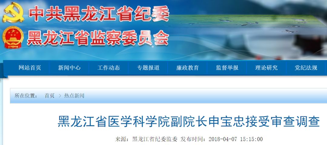 4月7日,黑龙江省纪委监委网站发布头条新闻——黑龙江省医学科学院副院长申宝忠接受审查调查。正文如下: