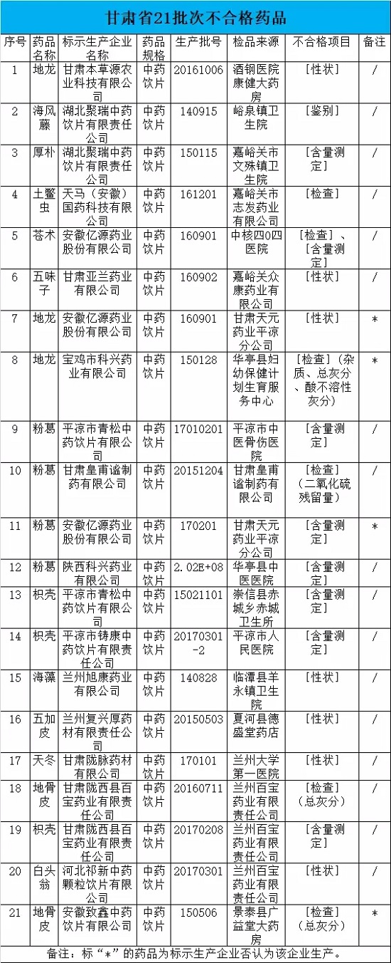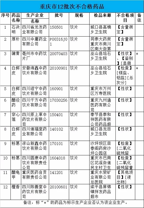 重庆12批次药品不合格,全为饮片;甘肃35批次,全为饮片;天津3批次,全为饮片;上海14批次,全为饮片;湖南42批次,41批次为饮片;山东87批次,80批次为饮片;江苏86批次,71批次为中药材及其饮片;浙江42批次,29批次为饮片;福建17批次,10批次为饮片;安徽10批次,4批次为饮片。