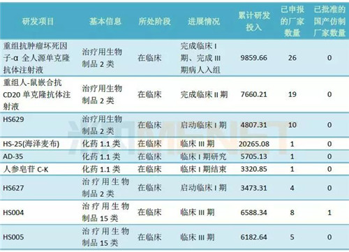 在创新药方面,管线产品中首个创新药海泽麦布(HS-25)Ⅲ期三个试验中,单药Ⅲ期于2017年7月完成入组,中间加入Ⅲ期、联合Ⅲ期临床研究也均进入入组最后冲刺阶段,为2018年新药申请提供了保障。其他在临床研究的创新药中,光敏剂HPPH进行了食管癌早癌及晚癌的初步有效性探索;人参皂苷C-K获得国家食品药品监督管理总局II/Ⅲ期临床研究批件并启动临床试验研究等。