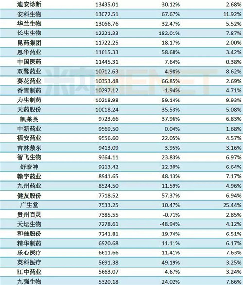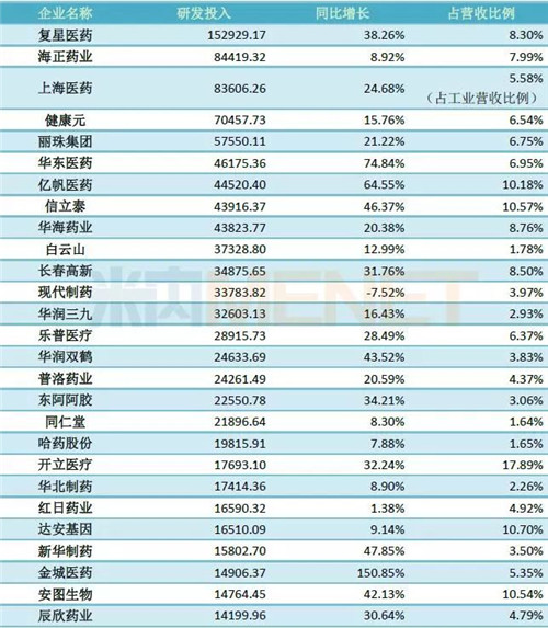 截至4月3日,A股共有106家医药企业披露了2017年业绩。在研发投入方面,超过10亿元仅复星医药1家;5亿-10亿元有4家,分别是海正药业、上海医药、健康元和丽珠集团;3亿-5亿元有8家,分别是华东医药、华海药业、亿帆医药等。值得一提的是,2016年,恒瑞医药研发投入11.84亿元,复星医药以11.06亿元紧跟其后;2017年,复星医药研发投入高达15.29亿元,同比增长近四成。