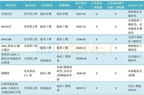 公司共获得注射用重组抗HER2人源化单克隆抗体-MCC-DM1偶联剂、羟基雷公藤内酯醇片等临床批件8个;SPH3127完成Ⅰ期临床,进入Ⅱ期临床;SPH3348原料加制剂临床申请获得受理等,进一步丰富了产品线。在一致性评价方面,共计开展70个品种(97个批文)的一致性评价工作,其中21个品种(26个批文)是289目录外品种。盐酸氟西汀胶囊以及卡托普利片已完成评价并申报至CFDA,近1/3的产品进入临床研究阶段。