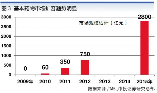 两次党代会和中办国办文件也强调了基本药物制度的重要性(见表1),并且规定,基本药物全部纳入基本药品保障报销目录,报销比例明显高于非基本药物,还对各级医疗机构规定了最低使用比例。其间,政府还投入了8500亿元以健全基本医疗卫生服务体系,建立基本药物制度等,基药销量也逐年大幅提升(见图3)。