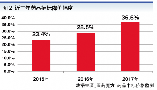 招标导致药品降价幅度逐年加剧,仅以2015-2017年为例,招标降价的幅度就依次增加到23.4%、28.5%和36.6%(见图2)。