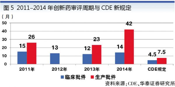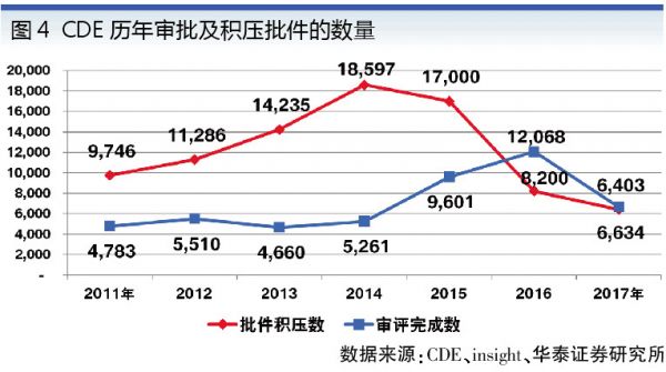 此次改革效果显著:提高了审评质量和标准,整治了科研造假不良风气,提高了审评审批透明度,药品审评积压问题如期解决(见图4),新药审评周期大幅缩短(见图5),仿制药质量和疗效一致性评价顺利起步。