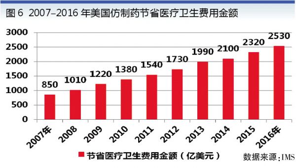 阶段四 (2017年始) ▍原研替代:未来控费利器 随着老龄化加剧、医保覆盖人群进一步加大,医保资金越发紧张,控费成为今后的重要任务。近年相继出台的降低药占比、辅助用药目录、重点监控目录等无不围绕控费展开,尽管也已取得了一定的效果,但并非治本之策。 按病种付费被多国证明是有效的控制药费的好方法,而DRGs(Diagnosis Related Groups,即疾病诊断相关分类)作为按病种付费的分支,是当今世界公认的比较先进的支付方式之一。 美国实施DRGs后,人均医疗费用支出增速得到了明显控制。其核心在于使医院有动力在确保疗效与原研药相同的前提下,大量使用价格更低的仿制药来替代原研药。十年时间,美国仿制药替代原研为国家节省了1.67万亿美元的医疗支出(见图6)。