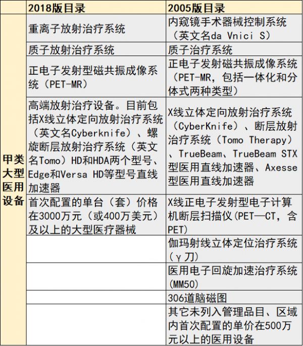 以下为2018版目录下甲类、乙类大型设备的具体品目,及2018版目录与2005版目录的对比情况: