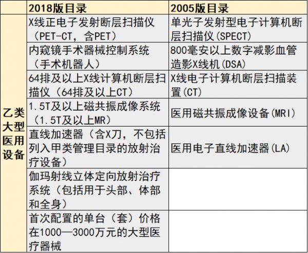 2018版目录之下,甲类大型设备的涵盖范围大幅缩减,仅剩下了PET-MR、高端及超高端放疗设备,入围门槛一下子由单价500万元抬到了3000万元。乙类大型设备的涵盖范围增加了,但主要是由甲类设备转移而来,乙类设备的入围门槛也大幅提升到1000万元。