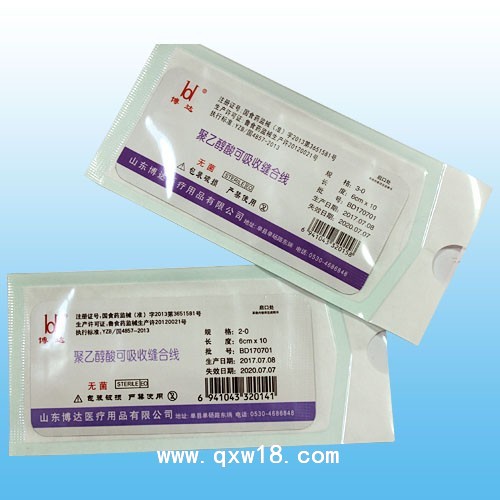 博达聚乙醇酸可吸收缝合线,是一种可吸收外科缝合线,新型的缝合材料,分带针与不带针两种,适用于外科手术对人体软组织的缝合。不适用于心血管和神经组织的缝合
