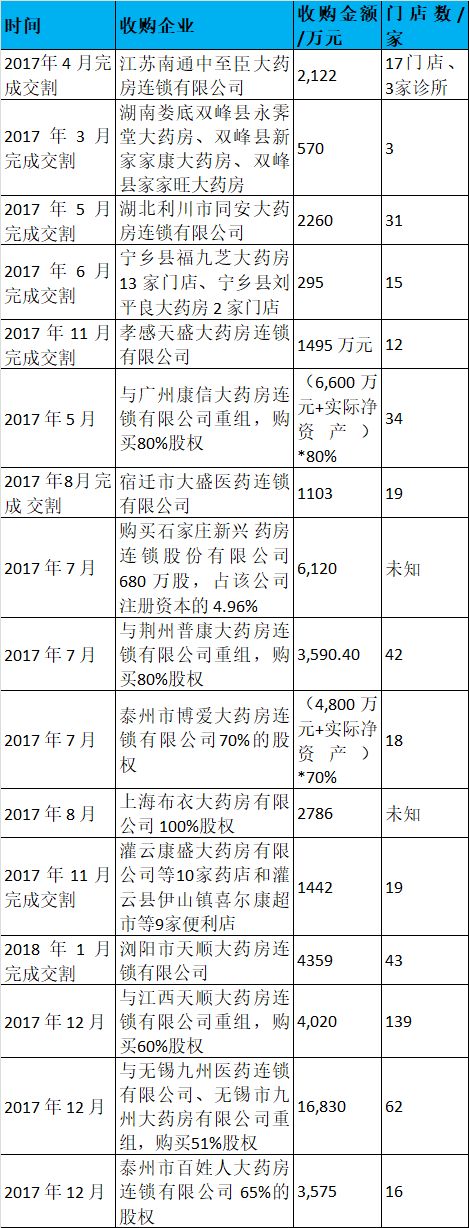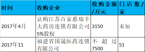 大参林:2017年大参林共发起2次并购,收下51家门店(数据来源网络)。