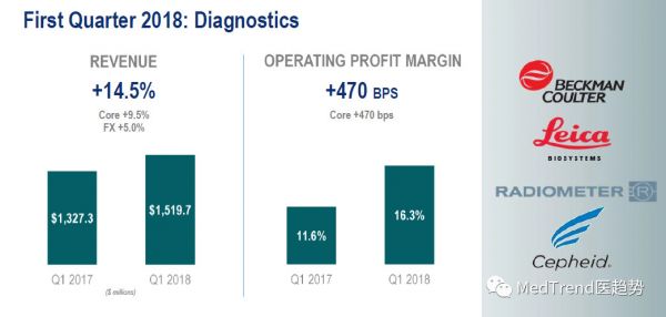 2018年Q1,雅培收购Alere后诊断业务高速增长,丹纳赫在诊断营收上落后雅培诊断约3亿美元,排名第三。