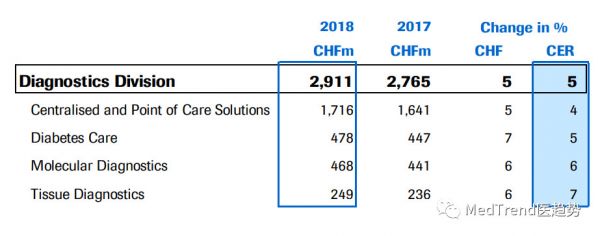 诊断部门贡献了29亿瑞郎的营收,同比+5%,由所有业务的增长驱动;占总营收的21%,比2017年占比的23%略有下降。