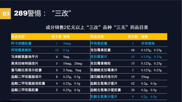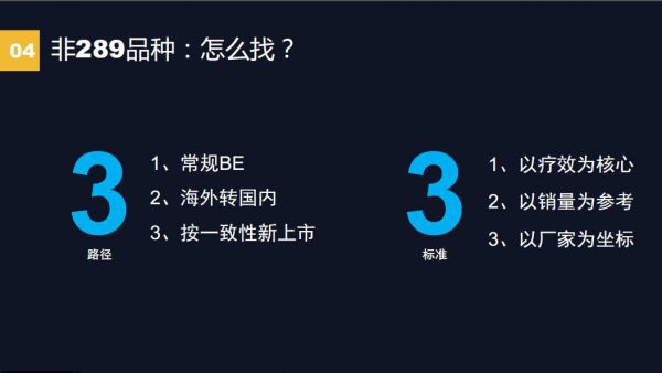 针对非289品种,有3个参考标准,以疗效为核心、以销量为参考、以厂家为坐标。