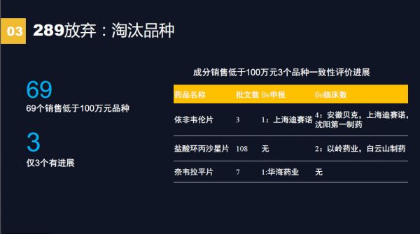 仿制药一致性评价时间紧、任务重,除了市场前景可观、具备竞争优势的当家品种外,有些289目录的品种,如国内特色三无品种、69个销售低于100万元的品种、三改品种,药企最好选择放弃。