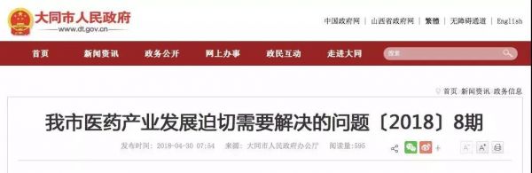 4月30日,大同市人民政府也发布《我市医药产业发展迫切需要解决的问题〔2018〕8期》。