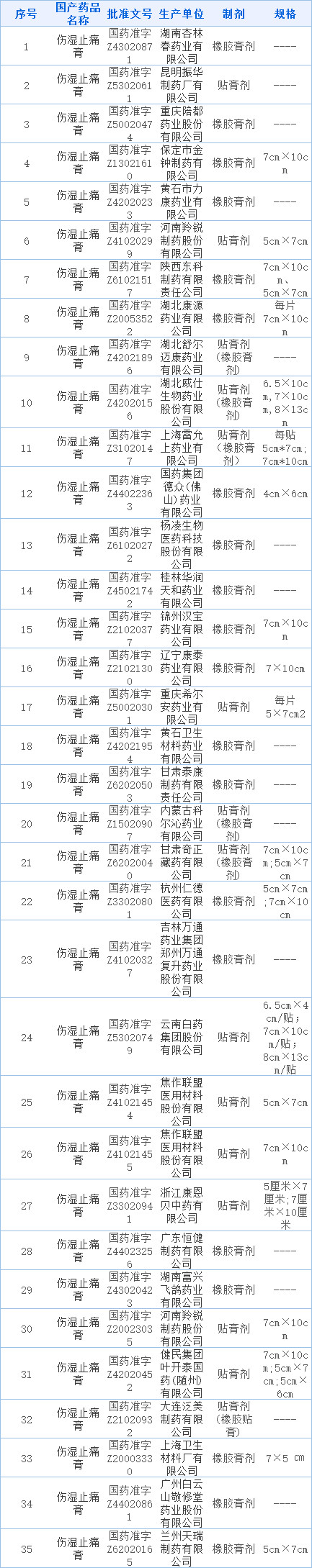 据查询,伤湿止痛膏共有35条批文,涉及国药集团、云南白药等知名药企。