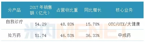 据华润三九2017年年报数据,2017年公司实现营业收入111.20亿元,同比增长23.81%,其中95.35%的营业收入来自医药行业;分产品中,自我诊疗业务实现营业收入54.29亿元,同比增长15.78%,核心业务包括OTC、OTX以及大健康业务;处方药业务实现营业收入51.74亿元,同比增长36.33%,核心业务主要是中成药。2017年,公司销售过亿产品21个,涵盖感冒、儿科、胃肠、骨科、皮肤、心脑血管、抗感染等多个领域。