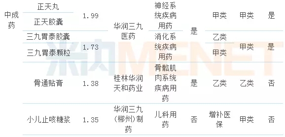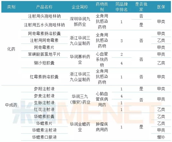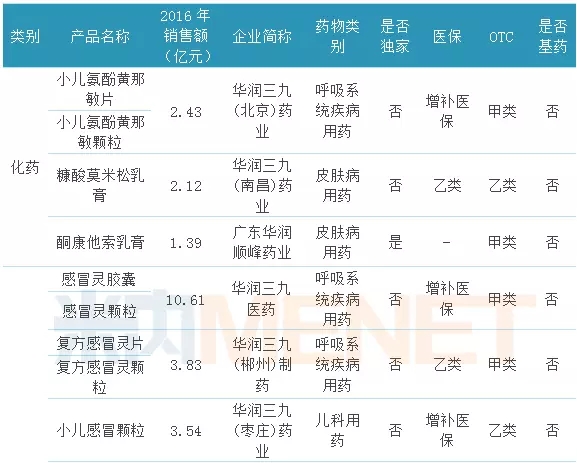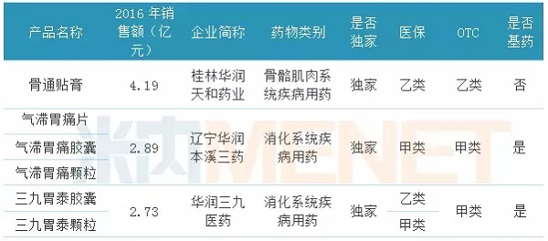 据米内网数据,2016年中国城市公立医院、县级公立医院、城市社区中心以及乡镇卫生院(简称中国公立医疗机构)终端,华润三九及子公司销售过亿的OTC类产品有3个,这3个产品均为中成药,且都是华润三九子公司的独家品种。