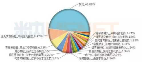三九胃泰胶囊及三九胃泰颗粒,是华润三九的独家品种,主要功效而清热燥湿,行气活血,柔肝止痛,用于治疗湿热内蕴、气滞血瘀所致的胃痛。2016年在中国城市零售药店终端胃药中成药TOP20品牌格局中,华润三九医药的三九胃泰颗粒位居首位,2016年的销售额为1.72亿元,同比去年增长0.53%;辽宁华润本溪三药的气滞胃痛颗粒及合肥华润神鹿药业的温胃舒颗粒均纷纷上榜,三款产品合计市场份额14.11%。