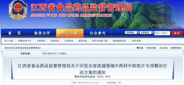 昨日(5月10日),江西省食药监局发布《关于印发全省流通领域中药材中药饮片专项整治行动方案的通知》,明确加强全省中药材、中药饮片质量安全和经营行为的监管,进行全省中药材、中药饮片市场大整顿。